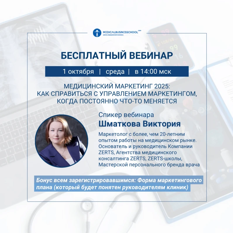 Друзья, приглашаем Вас на Бесплатный Вебинар «Медицинский маркетинг 2025:Как справиться с управлением маркетингом, когда постоянно что-то меняется» с