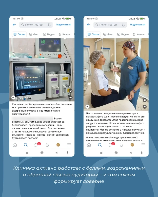 В проектах с долгим циклом принятия решения (например, хирургия, репродуктология, сложное стоматологическое лечение) соцсети чаще всего берут на себя задачу прогрева и формирования доверия. Человек может месяцами наблюдать за врачом, отслеживать реакции на вопросы и постепенно убеждаться, что именно этому специалисту можно доверять.