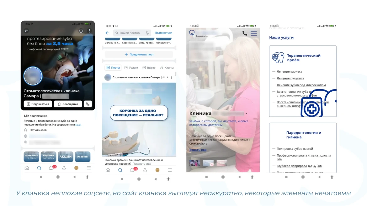 Контент в соцсетях создаёт определённый образ клиники – а остальные точки контакта вообще его не поддерживают. Например, сайт выглядит устаревшим, а отзывы – все как “под копирку”.